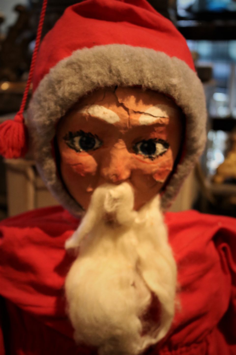 Old Santa Claus with felt clothes, cotton beard, clogs and painted papier-mâché face, as well as a really nice patina...