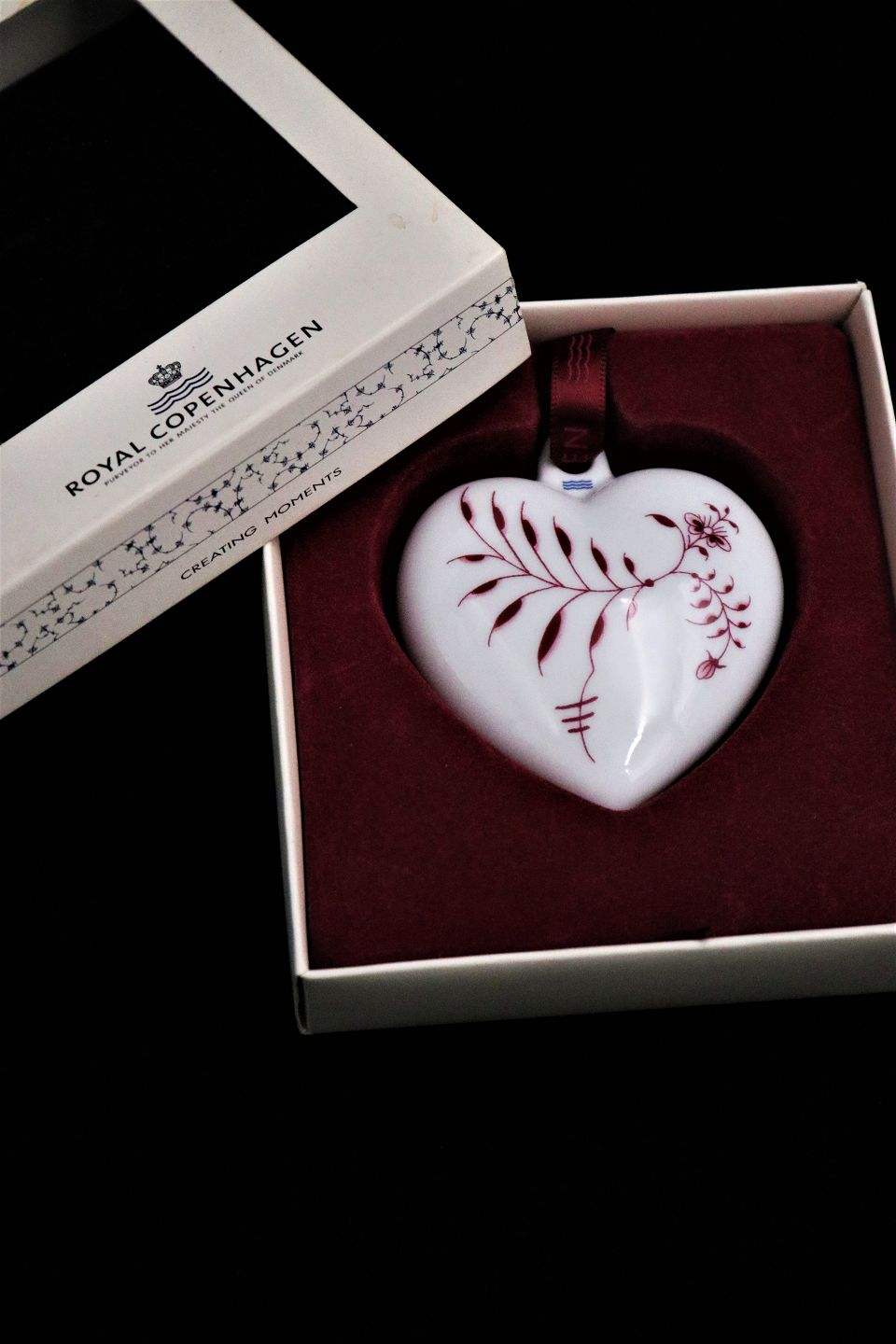 Royal Copenhagen Musselmalet Purpur farvet julehjerte. H:7,5cm B:6,5cm. Er i hel og i fin stand (Original æske) Emne nummer: RC julehjerte purpur