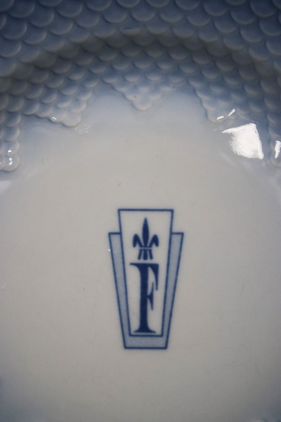 Bing & Grøndahl Blå tone middagstallerken i jernporcelæn / Hotel porcelæn med logo "F og den franske lilje" fra den gamle restaurant fregatten i tivoli i københavn.