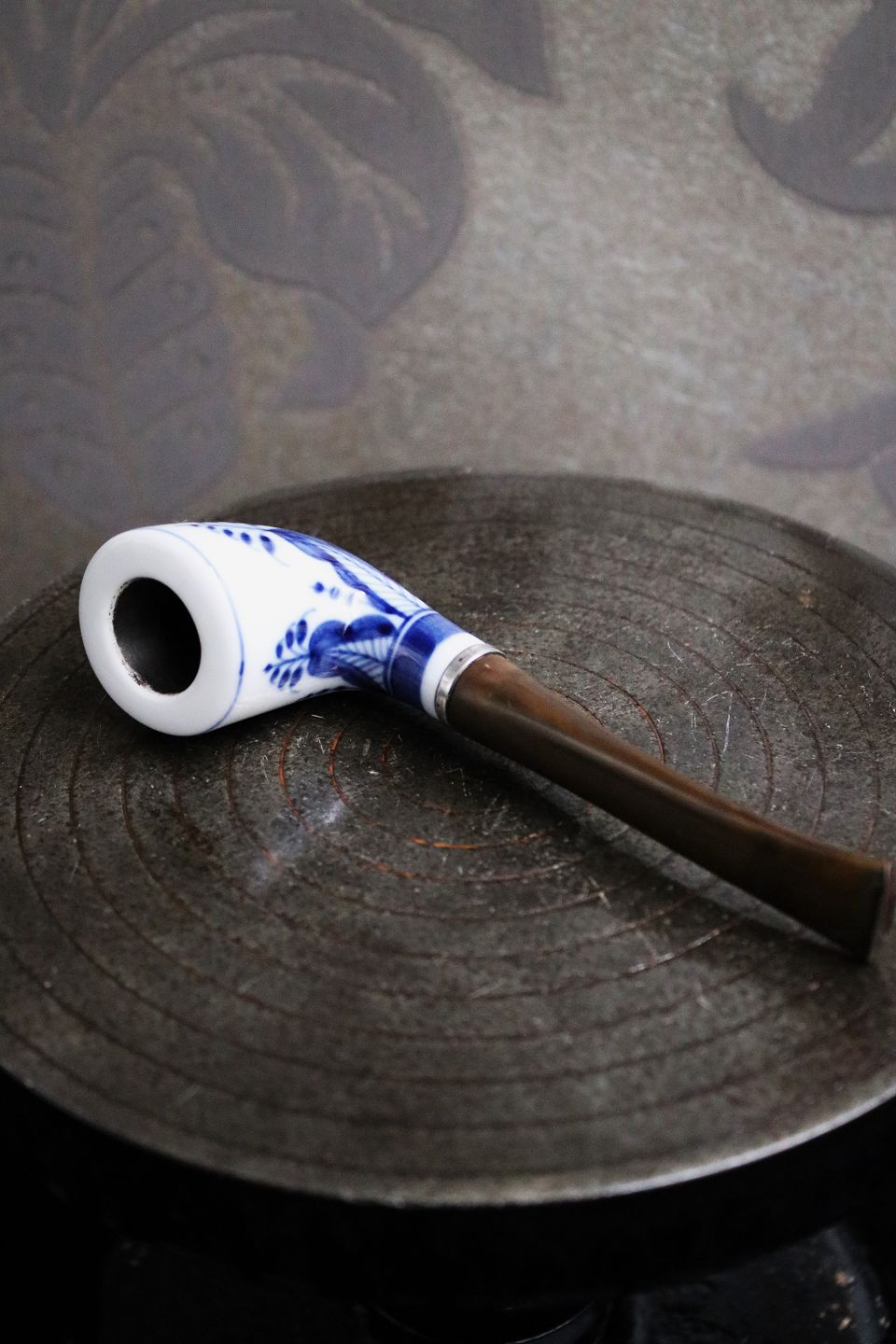 Gammel pibe i Musselmalet porcelæn og horn fra Royal Copenhagen.