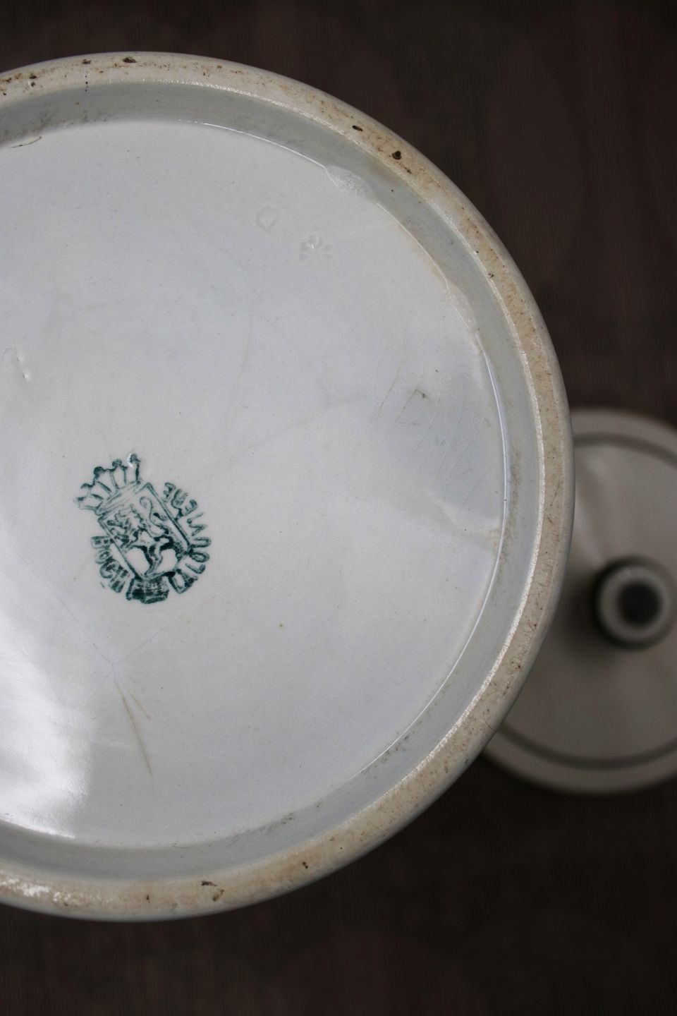Gammel fajance låg krukke til kaffe (Cafe) med en rigtig fin gammel patina. H: 22cm. Dia.: 16cm. ( Fin til kapselkaffe eller hele bønner )