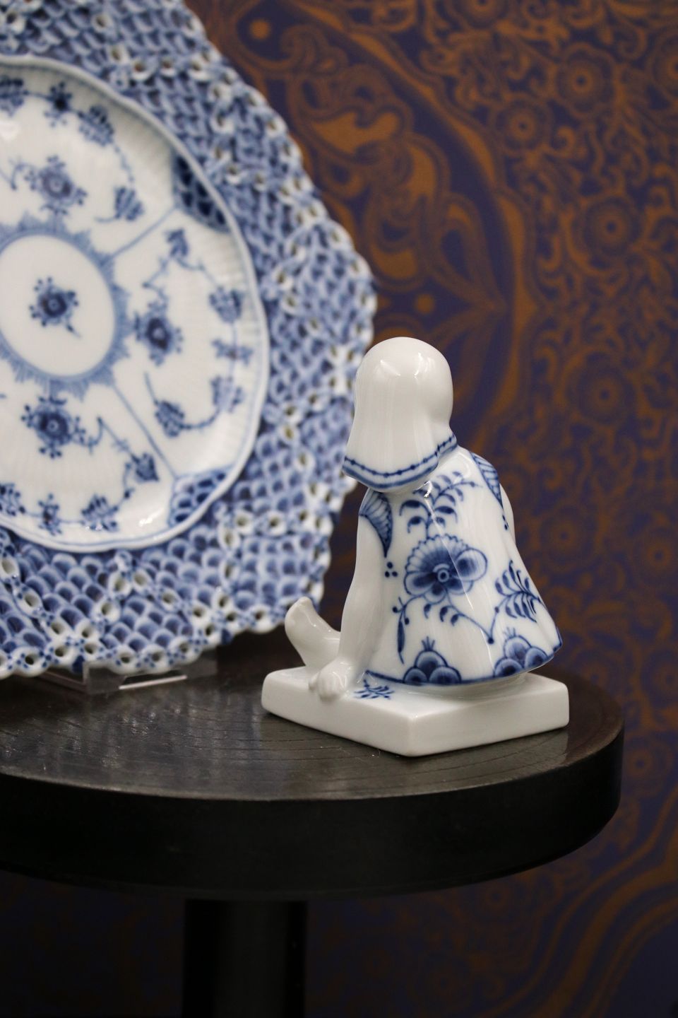 Royal Copenhagen , lille Musselmalet siddende pige. Dekorationsnummer: 1/4793. 1.sortering. H: 9,5cm. Er i fin stand. Emne nummer: RC# 1/4793