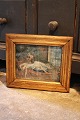 Antique, 19th century colored etching of Faun & sleeping woman, framed in old gold-plated wooden frame with glass.