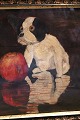 Decorative, old oil painting with a motif of a small dog sitting on a table with 2 apples. The painting is framed in an old black painted wooden frame with glass and gold decoration with leaf vine. H: 26cm. W: 35cm.