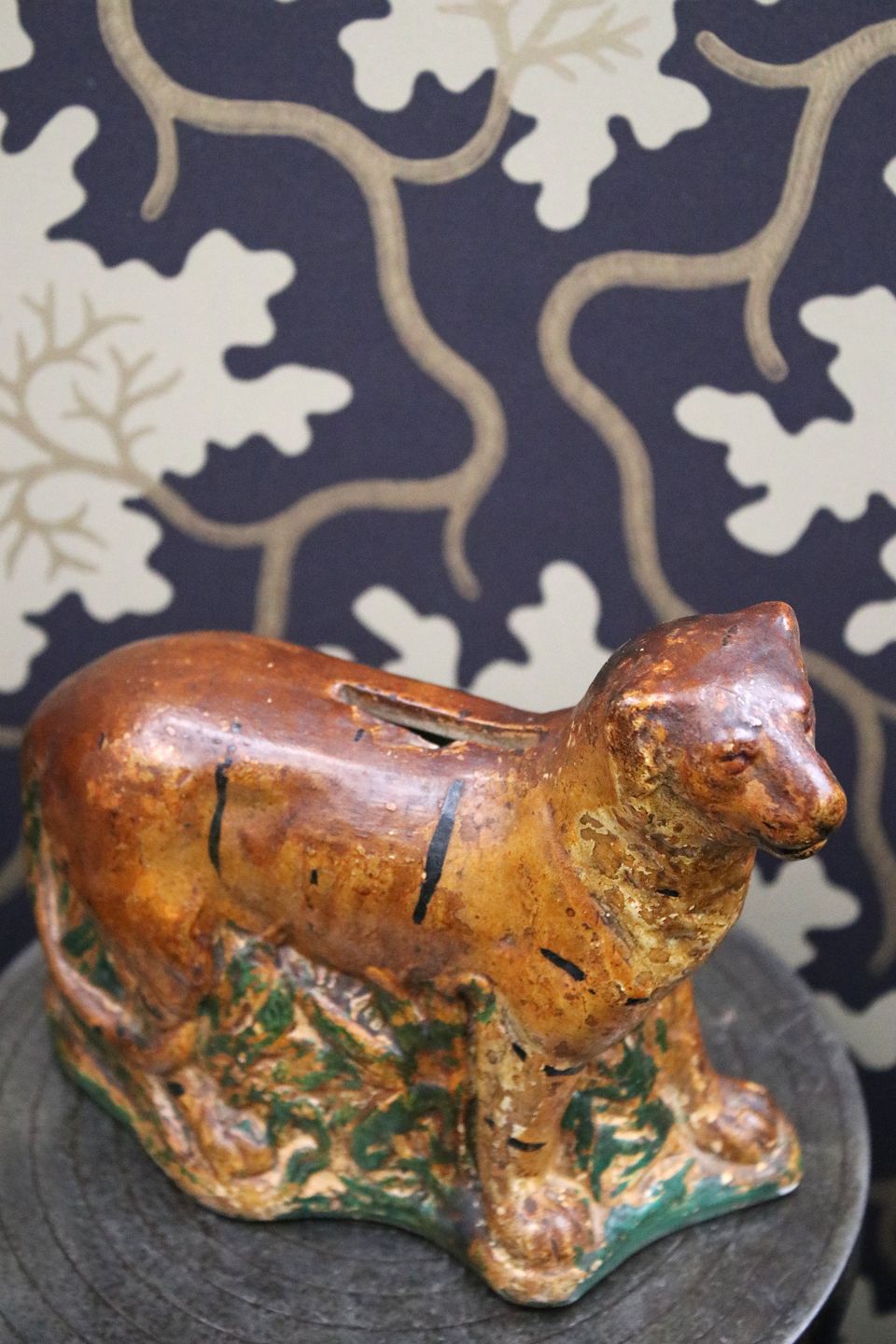 Antique Bornholm ceramic piggy bank in the shape of a tiger with old original painting...