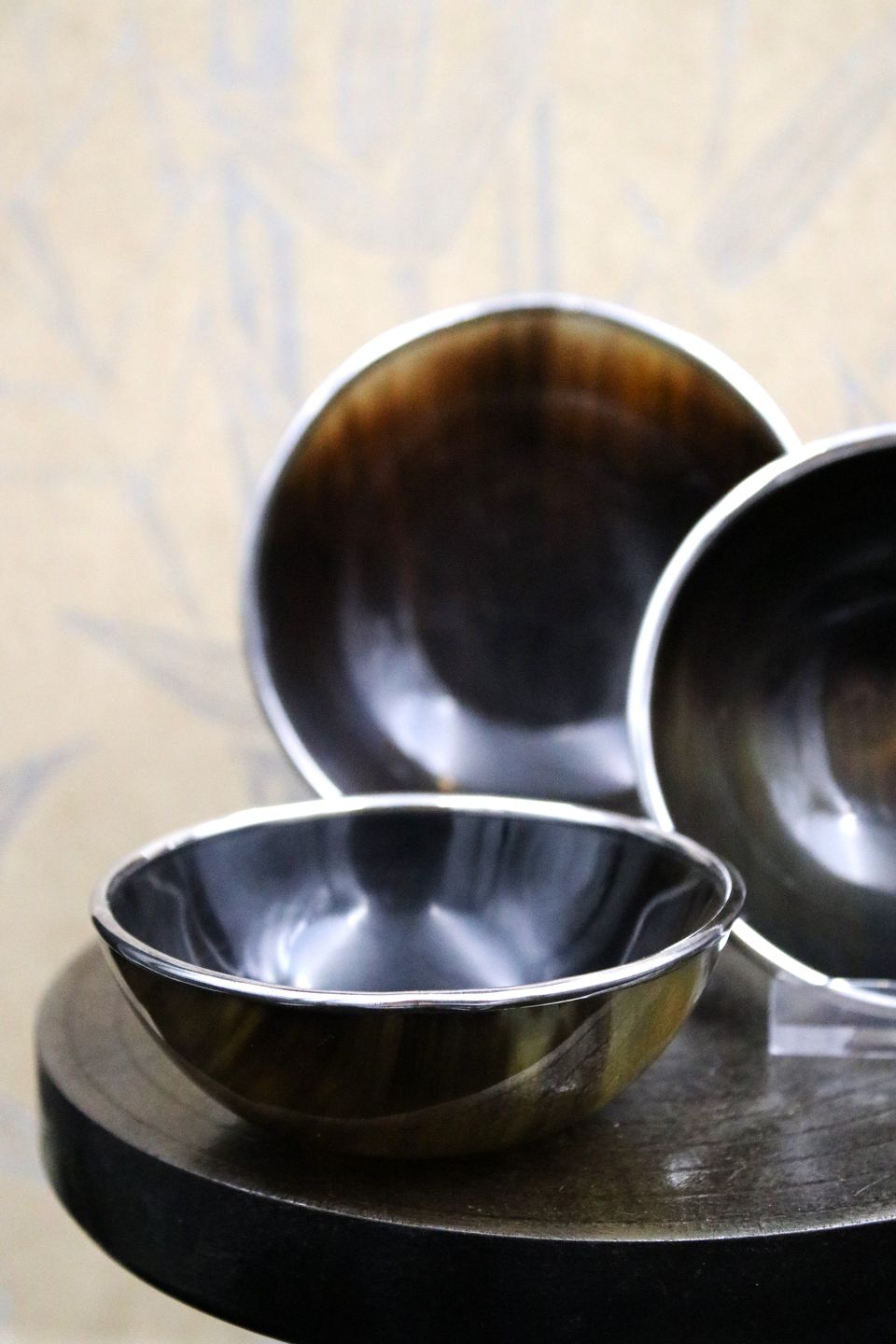 Small horn bowls mounted with silver rim (stamped) for caviar.