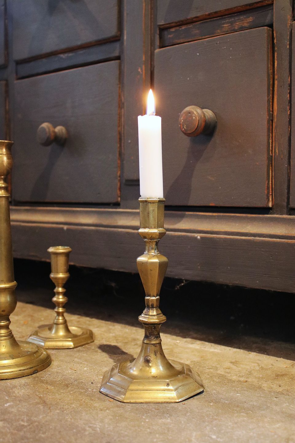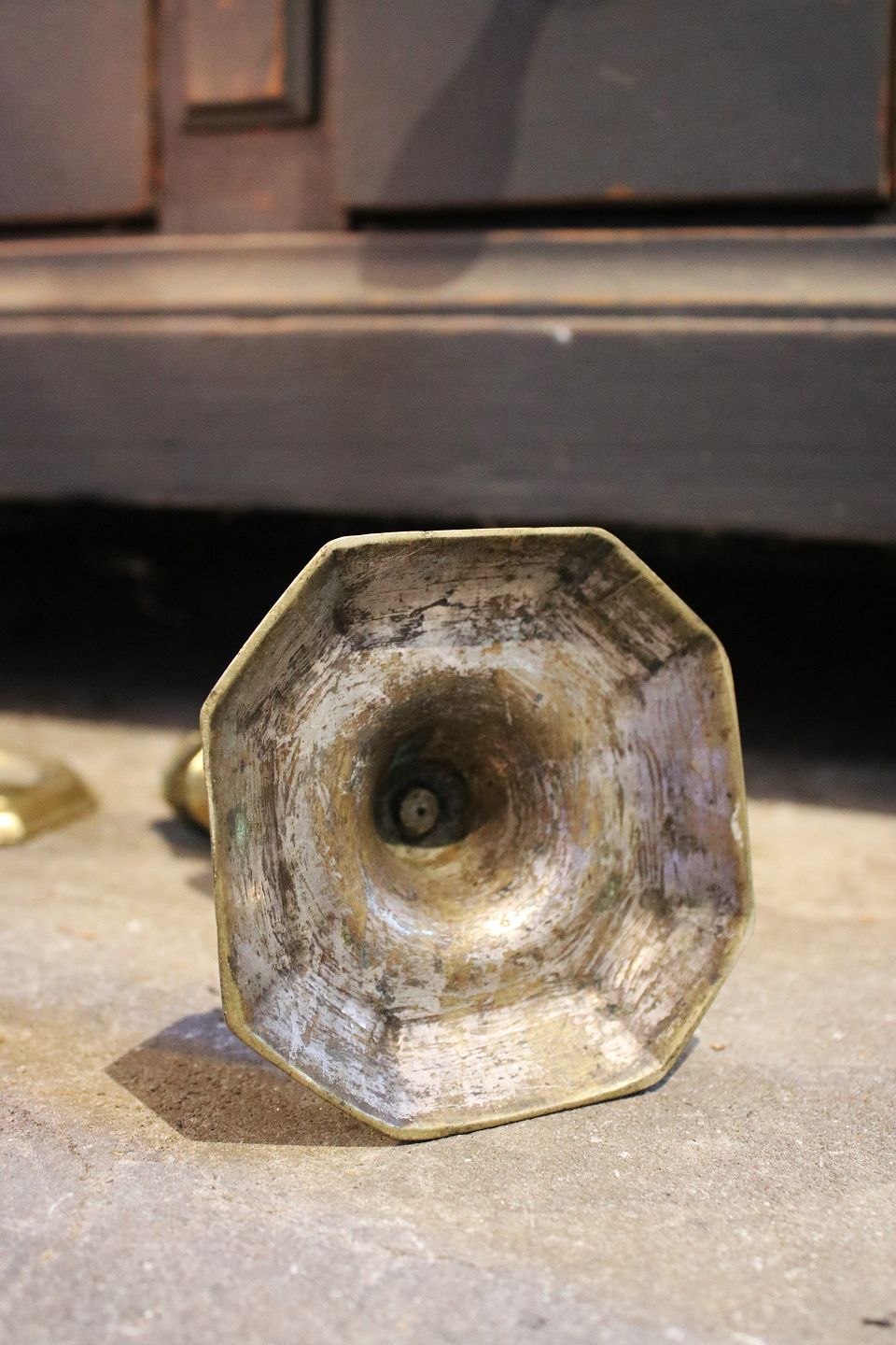 Et par 1700 tals lysestager i messing med en rigtig fin patina. Højde: 19cm.