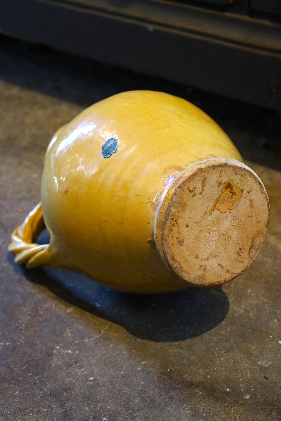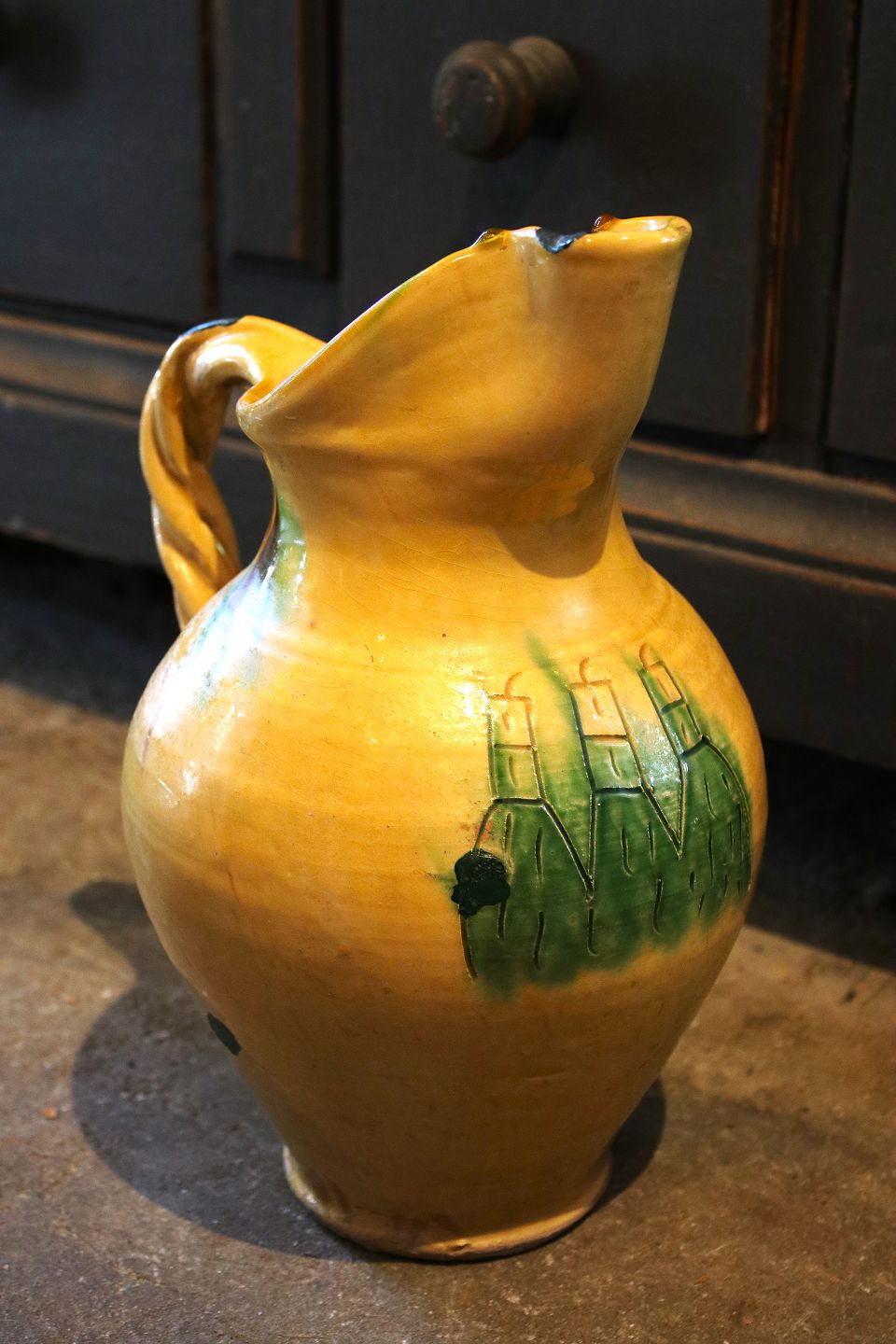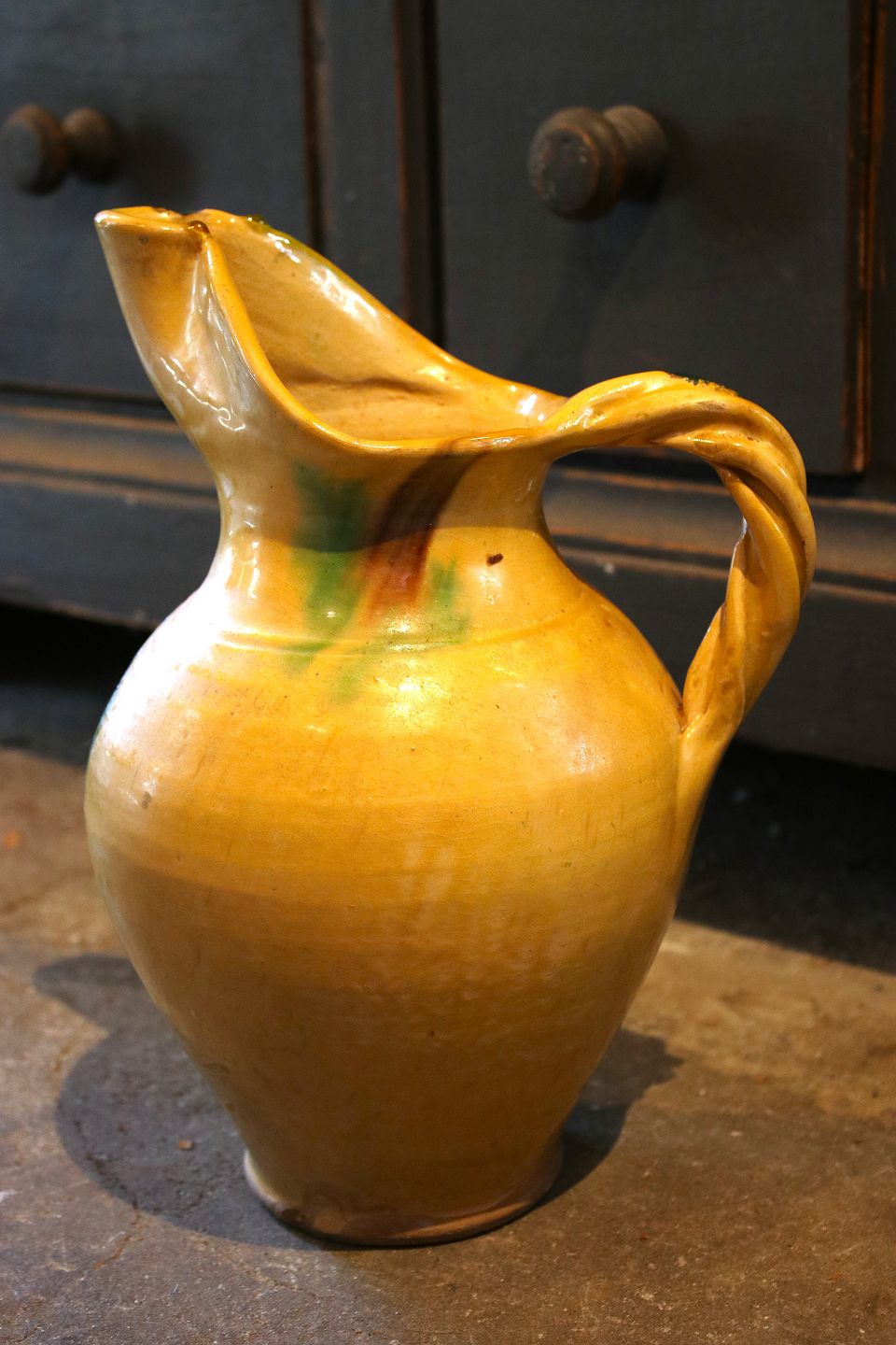 Gammel italiensk vin kande i keramik med fin gul glasur og snoet hank. Kanden har et lille kantafslag på hældetuden. H: 28cm. Emne nummer: Vin kande