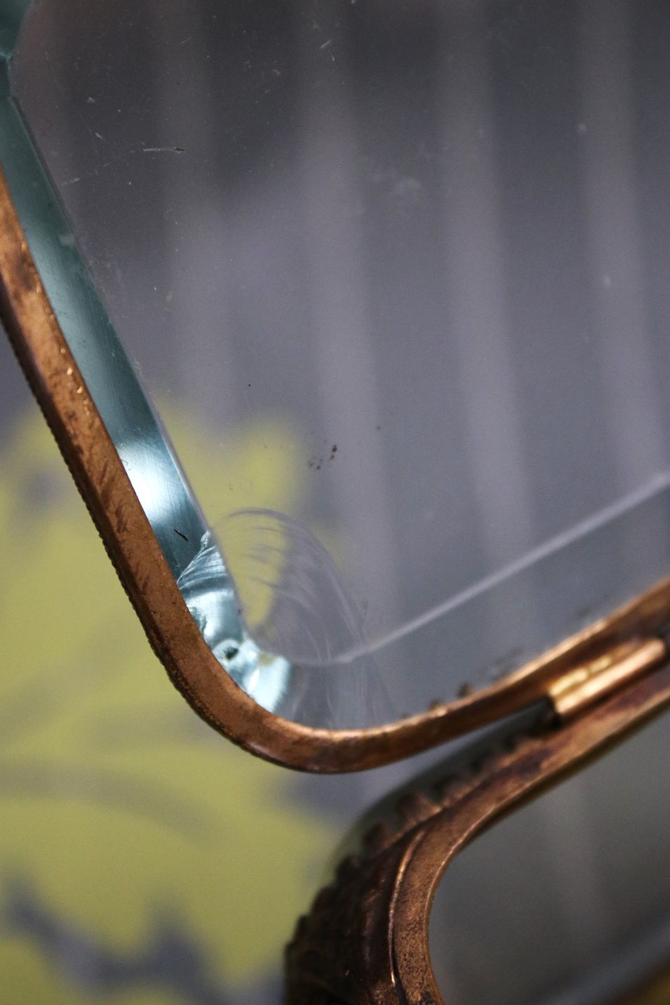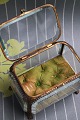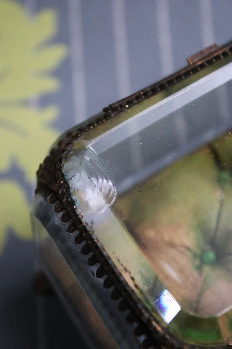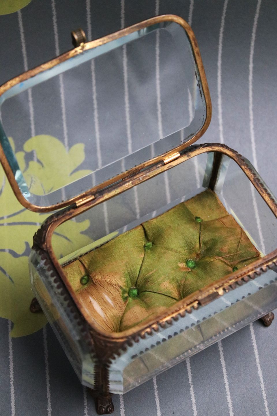 Antique French jewelry box in bronze with faceted glass and silk cushion at the bottom...