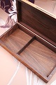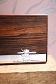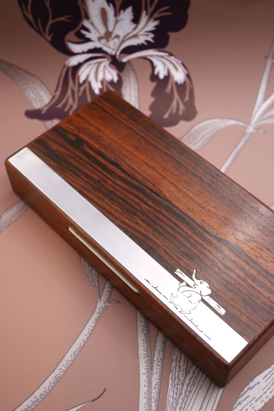 Aflang æske i palisander dekoreret med sølv indlægning med motiv af lille elefant som bære en træstamme...