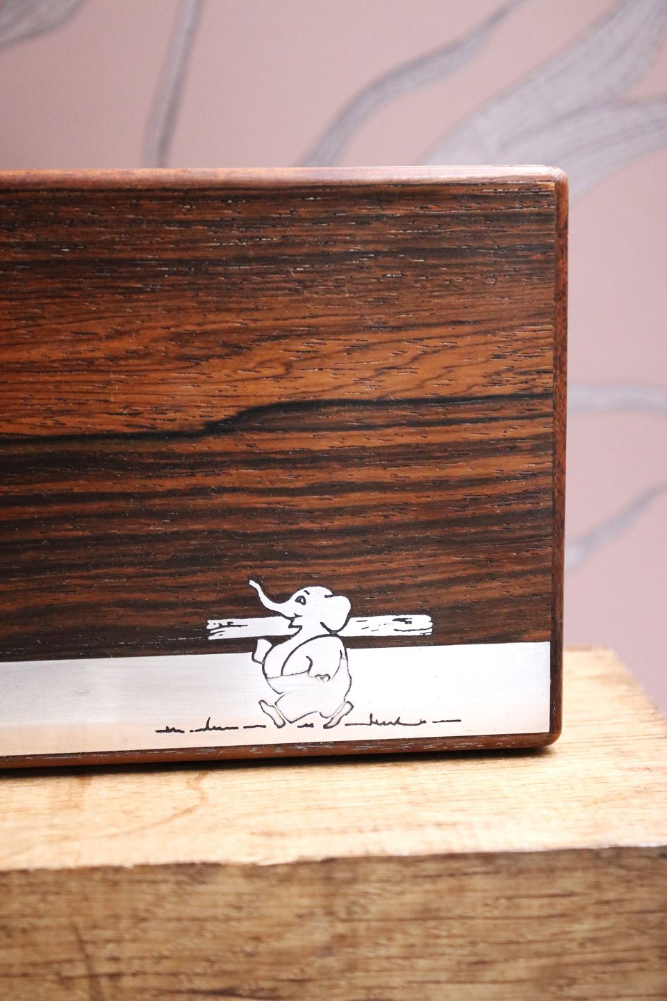 Aflang æske i palisander dekoreret med sølv indlægning med motiv af lille elefant som bære en træstamme på skulderen.