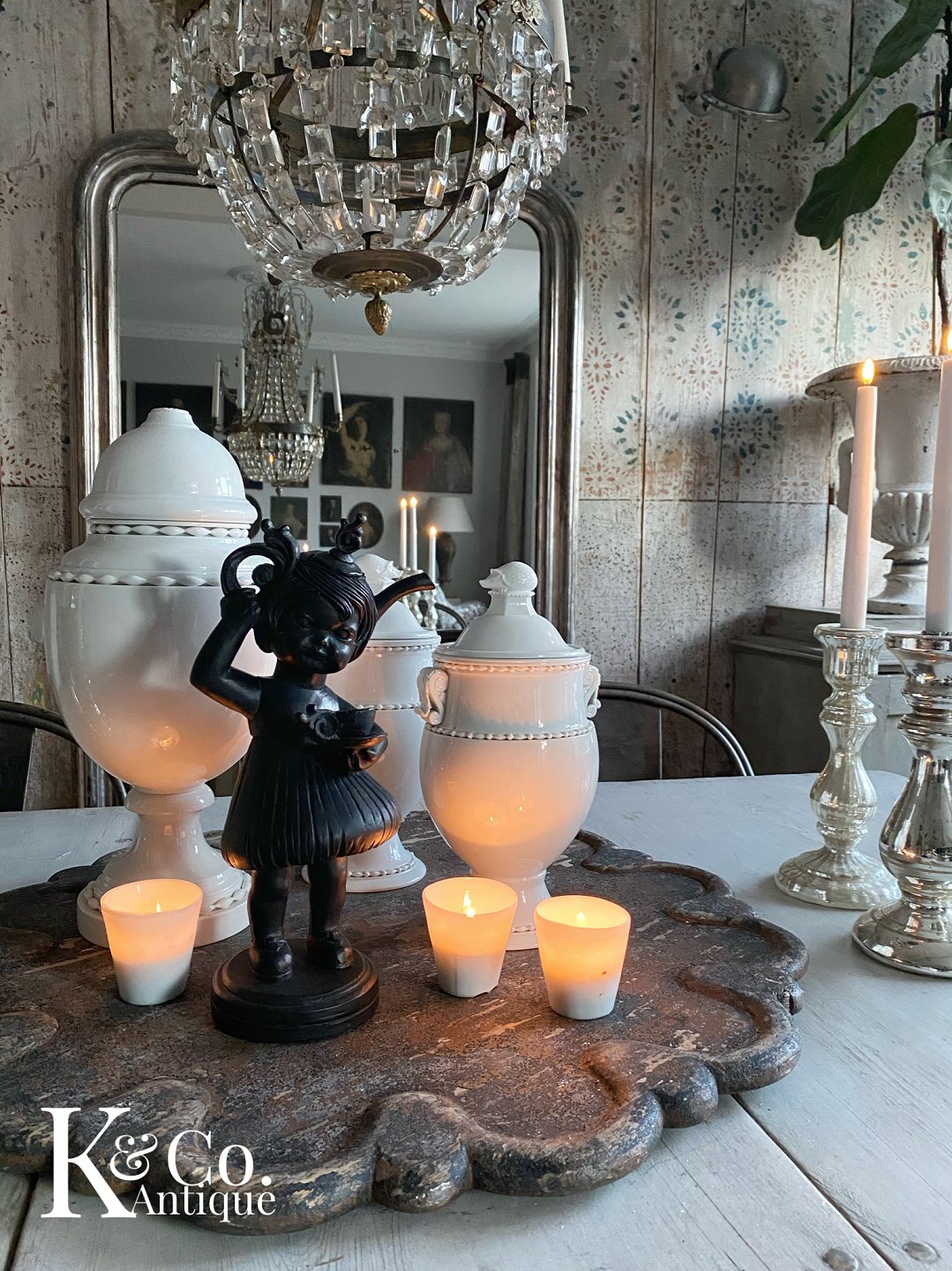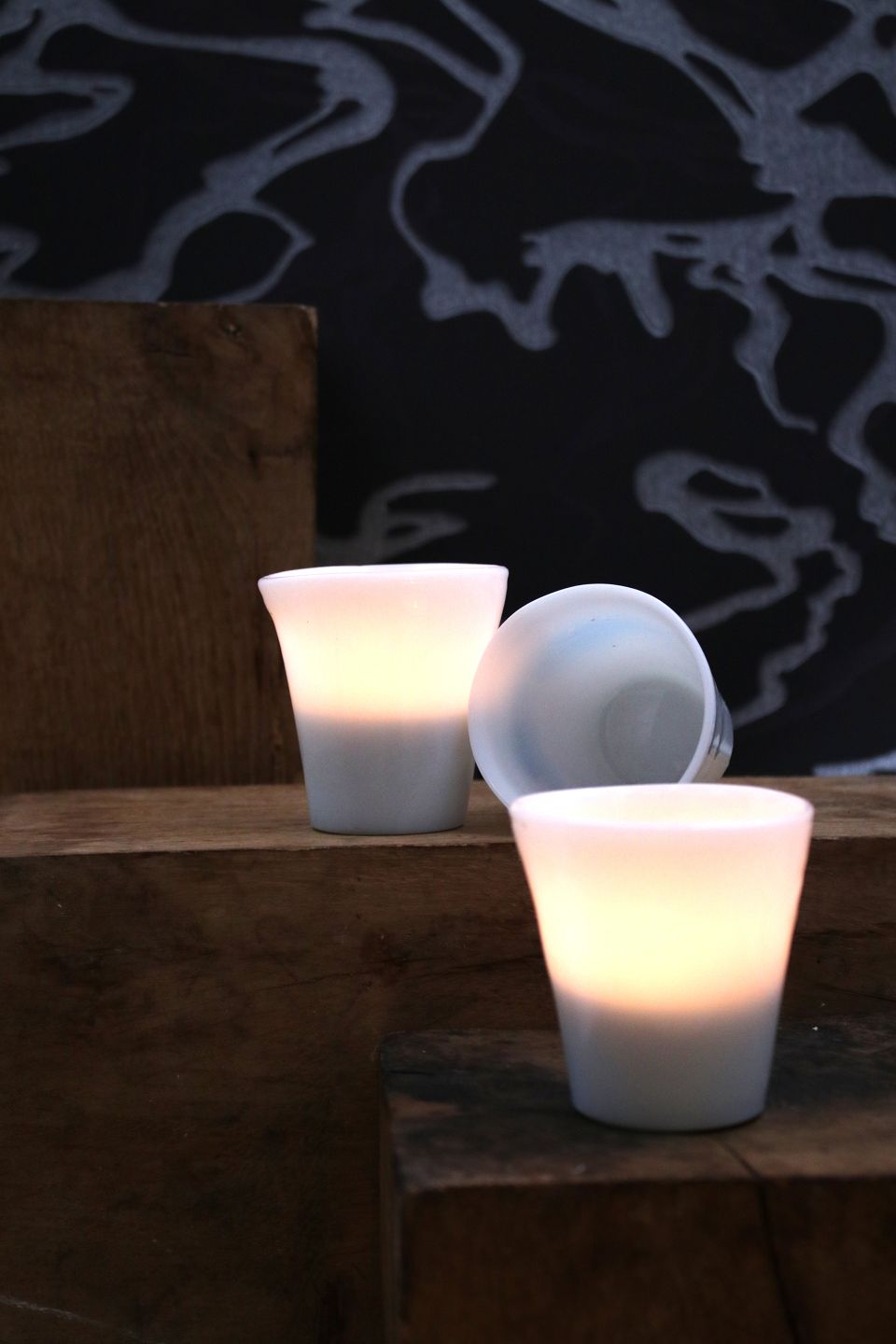 Gamle mundblæste lys glas i hvid opalglas til fyrfadslys. H: 6,5cm. Dia.: 6,5cm. Emne nummer: Lys glas