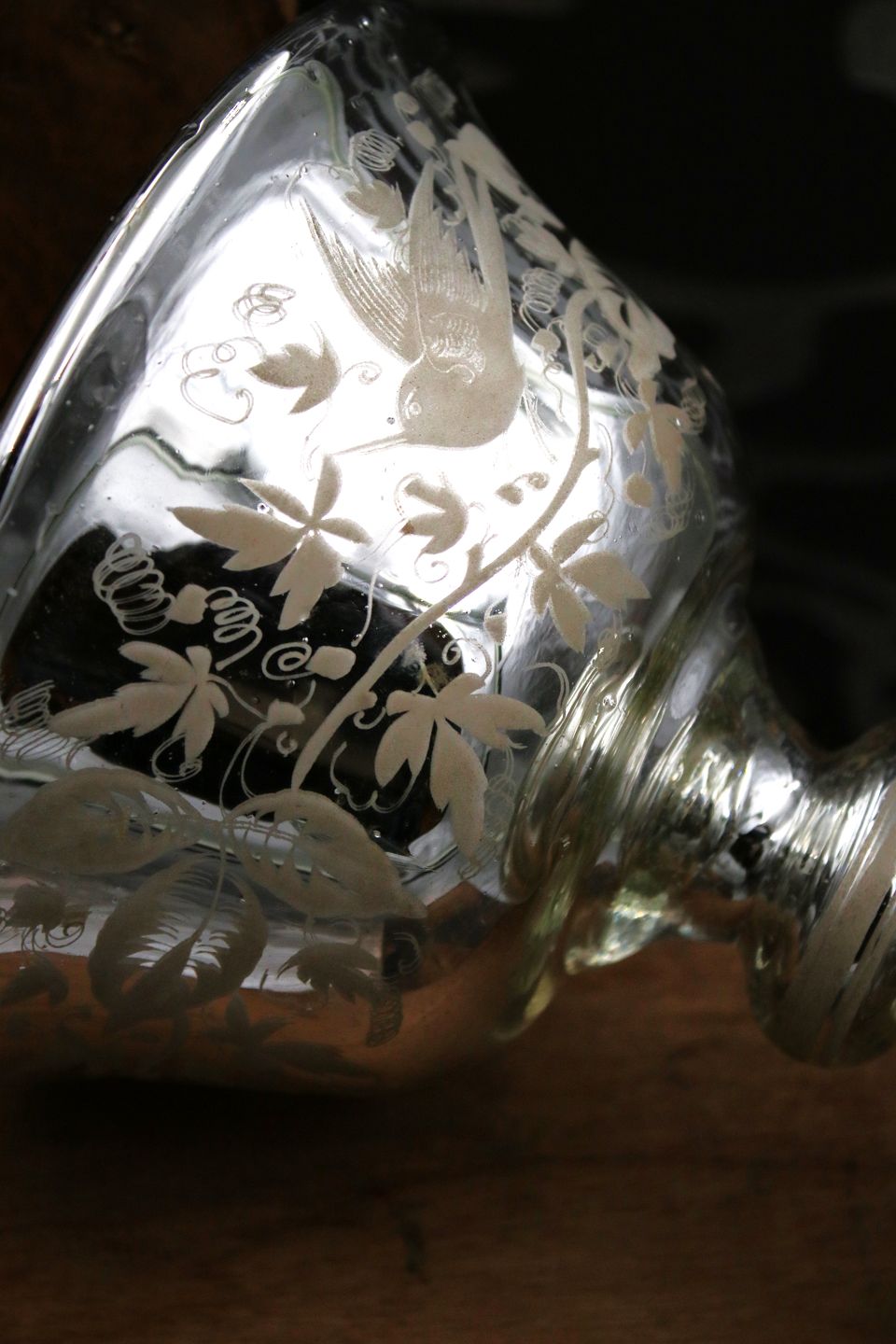 Fantastically beautiful 19th century bowl on foot in poor man's silver (Mercury silver glass) with fine etched decoration with birds and leafy tendrils. Height: 18cm. Dia.: 18cm.