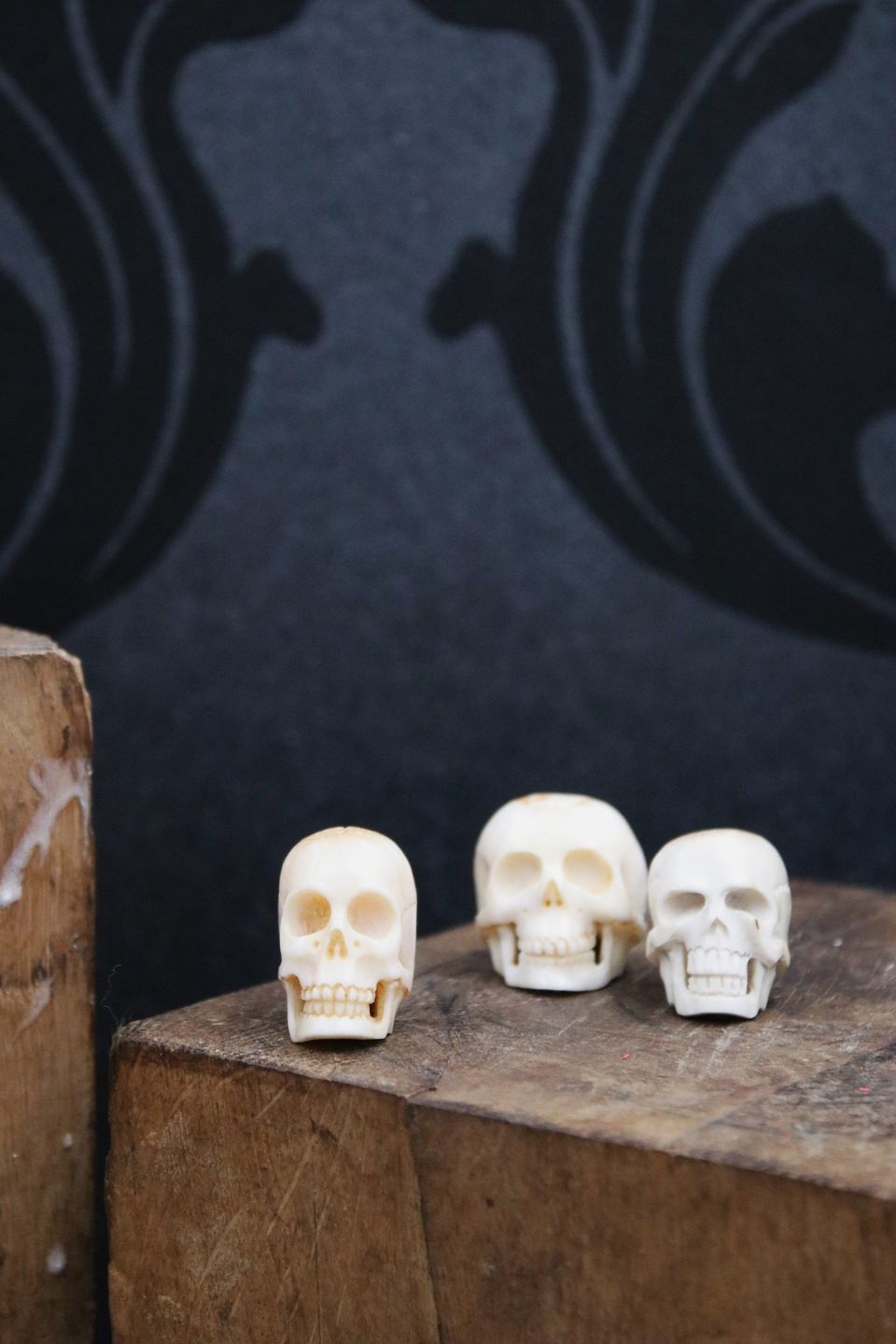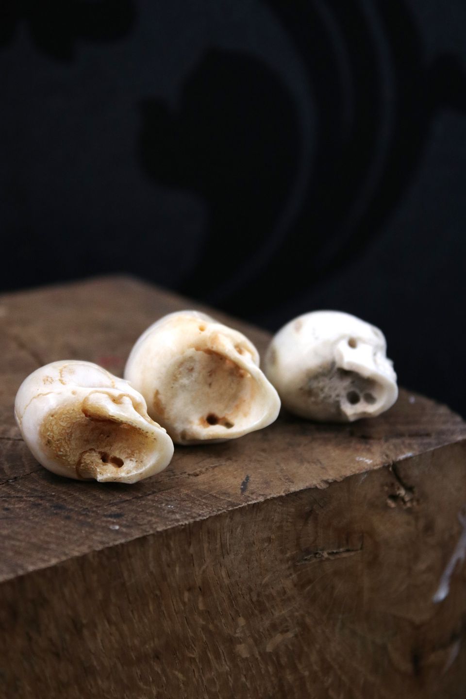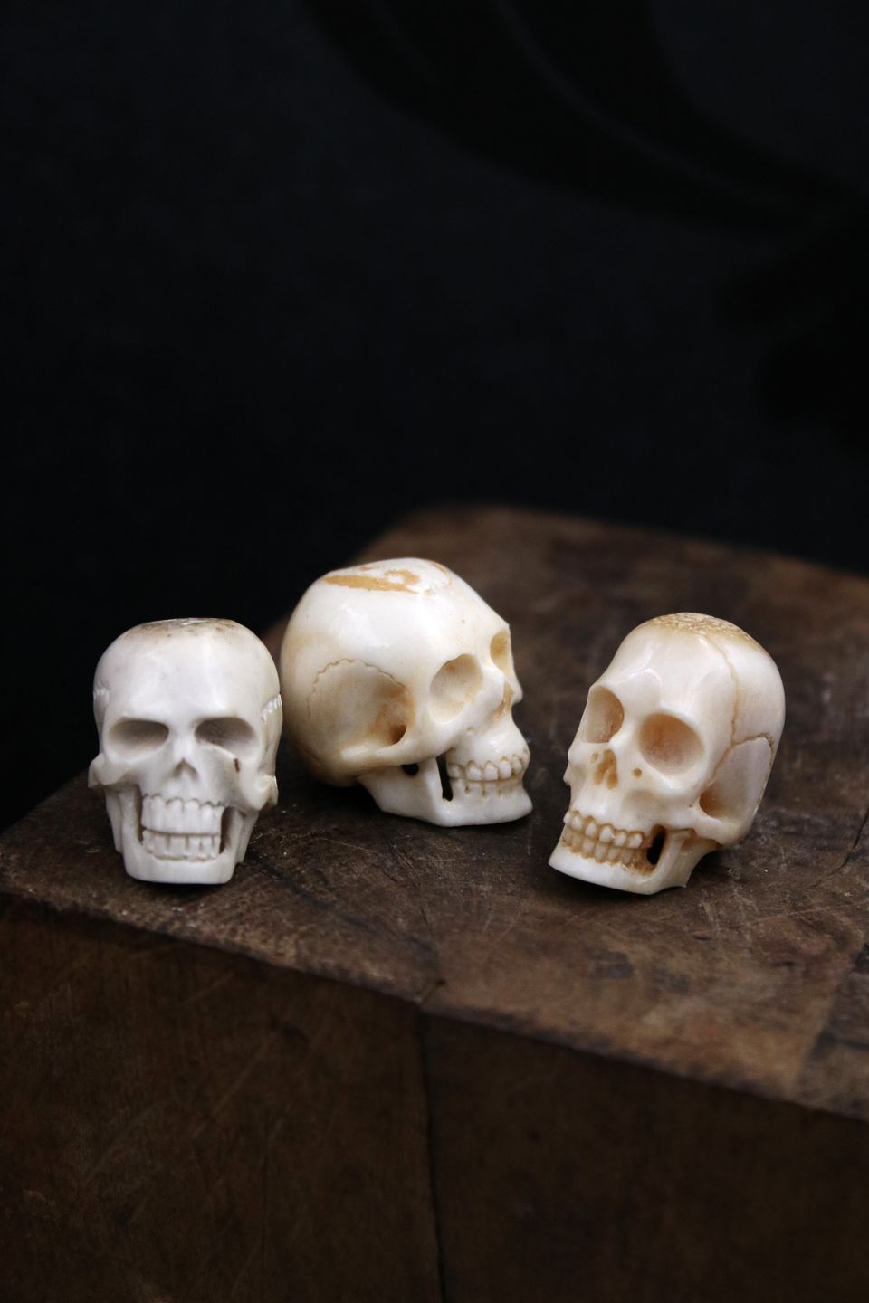Old, decorative mini skulls carved in horn / bone.