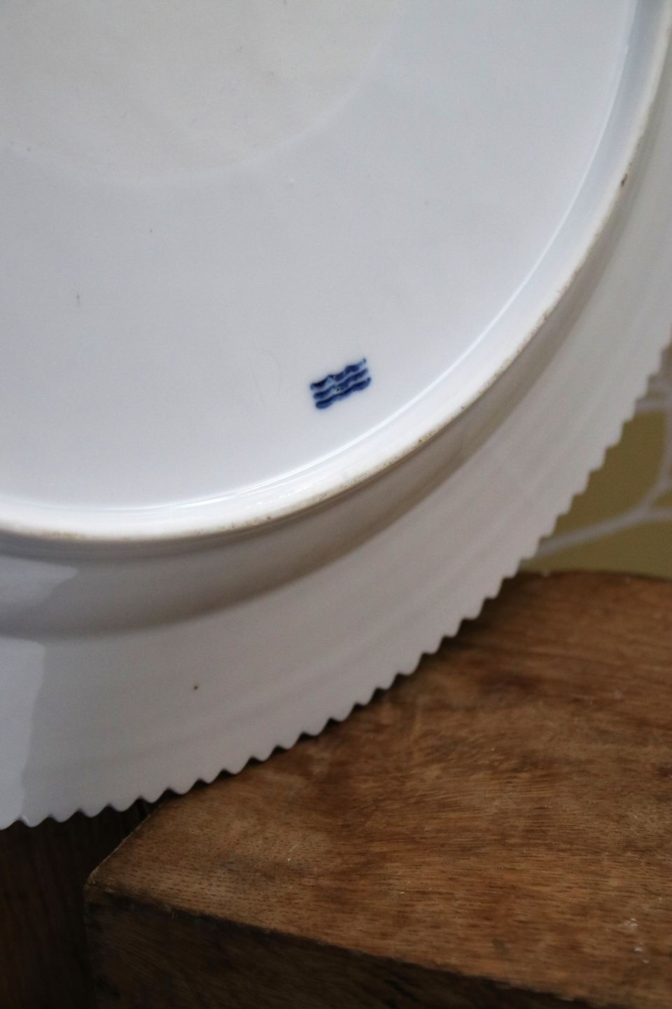 The dish has a burn crack on the edge and some small glaze marks on the bottom, see extra pictures.