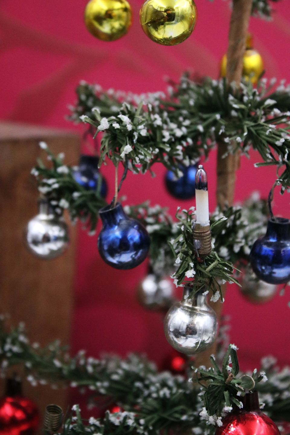Antikt miniature juletræ , lavet i farvet papir og dekoreret med masser af små farvet jule glas kugler. Højde: 35cm. Emne nummer: Miniature juletræ