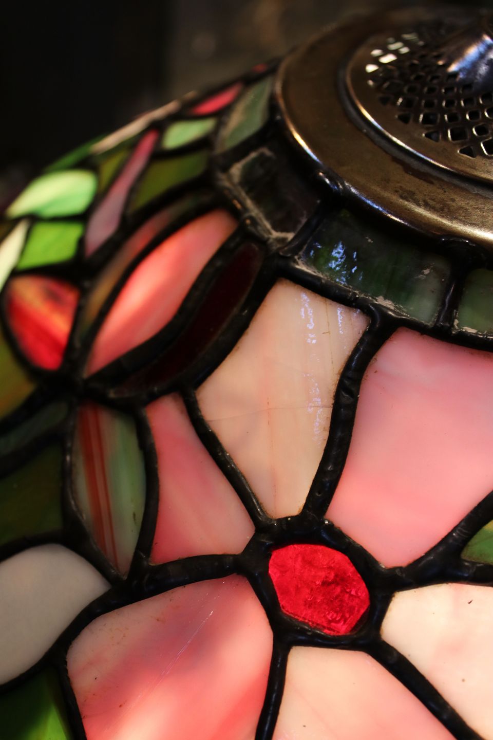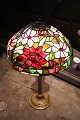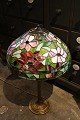 Dekorativ , gammel Tiffany bordlampe fra 40érne. med glasskærm i farvet blomstermotiv og fod i bronze...