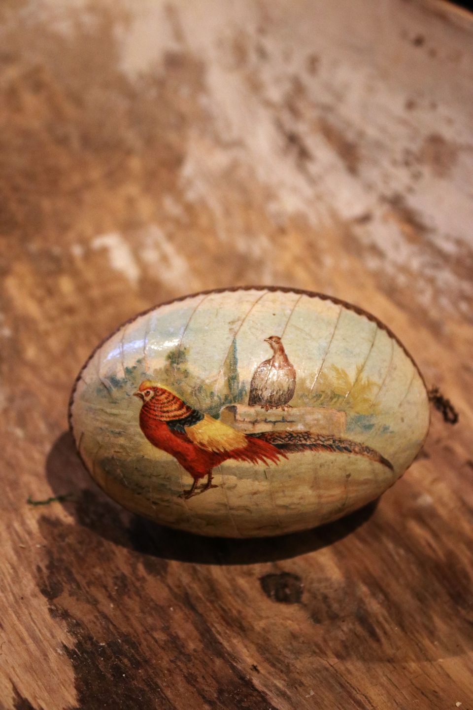 Old wooden Easter egg with painted peacocks from the early 1900s, dated inside 1904. Height: 10.5cm. Item number: Påskeæg nr.8