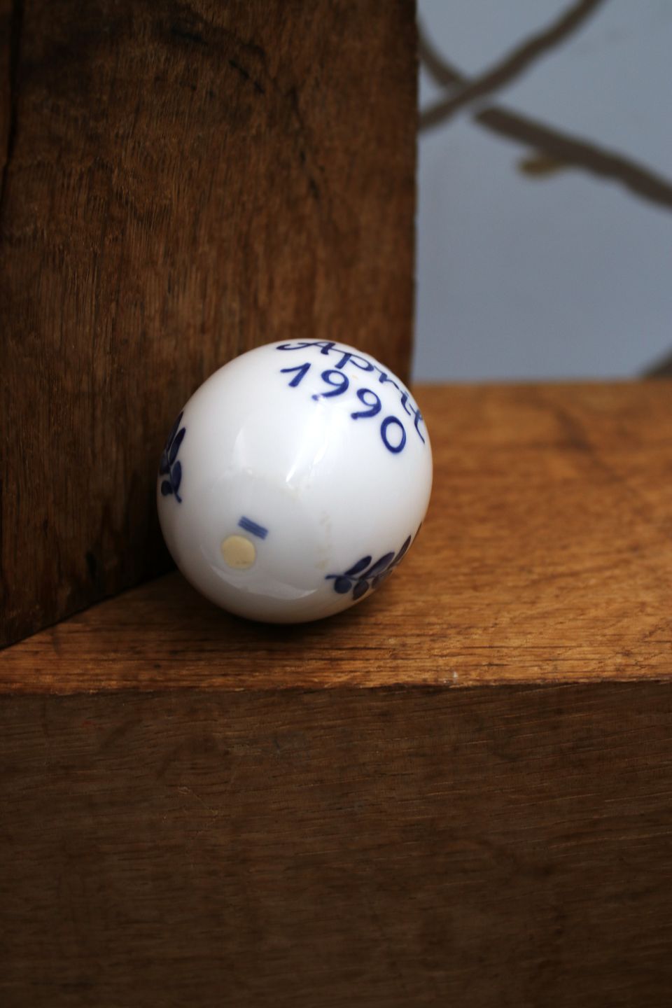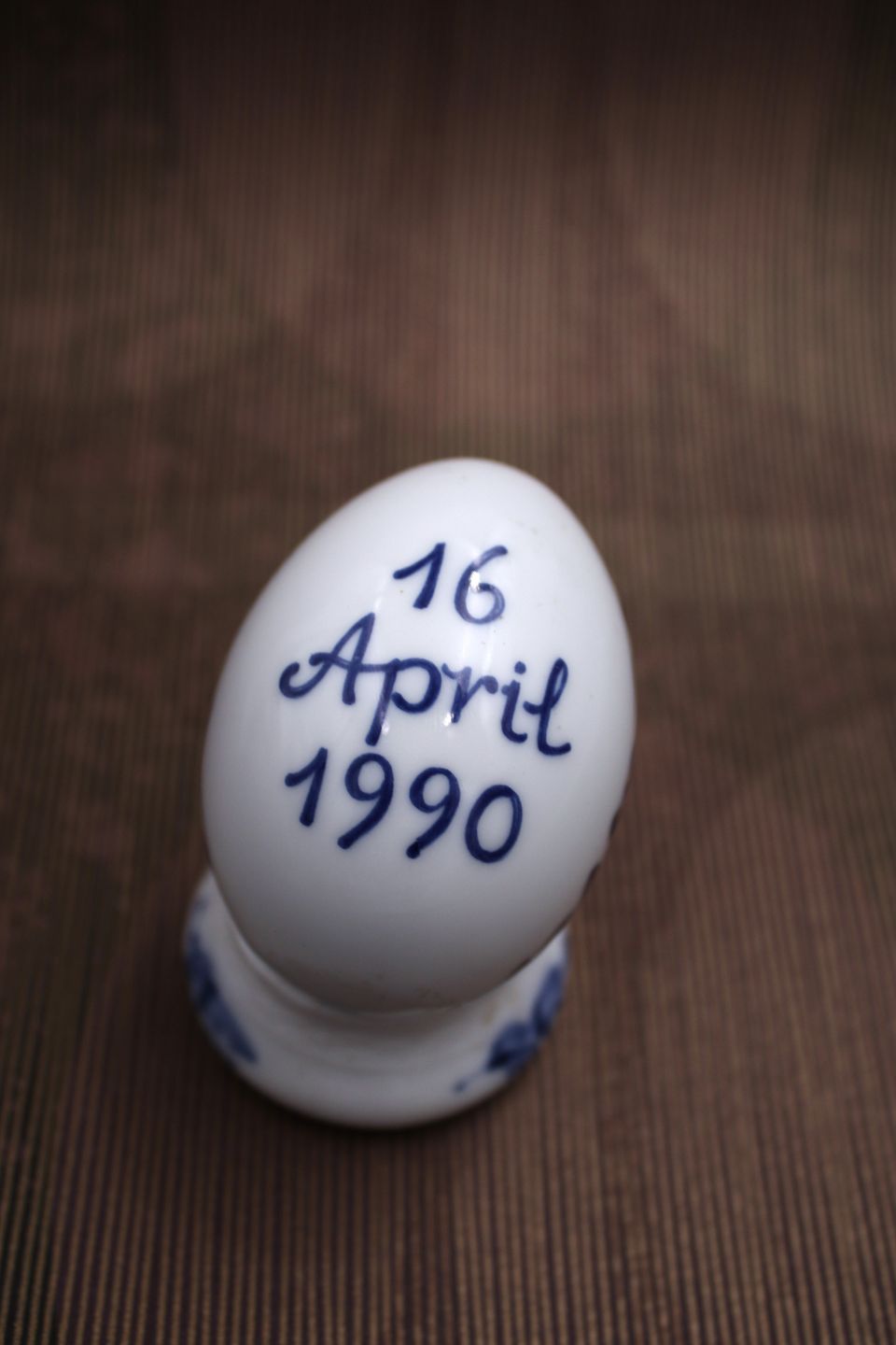 Royal Copenhagen porcelæns æg med Dronning Magrethe II monogram og inskription 16. april 1990 , lavet i forbindelse med Dronningens 50 års fødselsdag. H: 6cm. Dia.: 4,5cm.