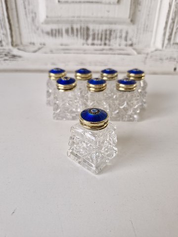 Sæt på 8 saltbøsser i krystal med låg i forgyldt sølv og emalje