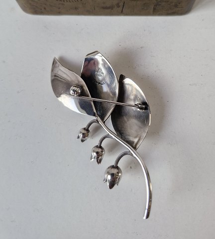 A. Michelsen sølvbroche i form af liljekonval, de tre små blomster er bevægelige. Stemplet: AM - Sterling - Denmark Mål 3 x 7 cm.