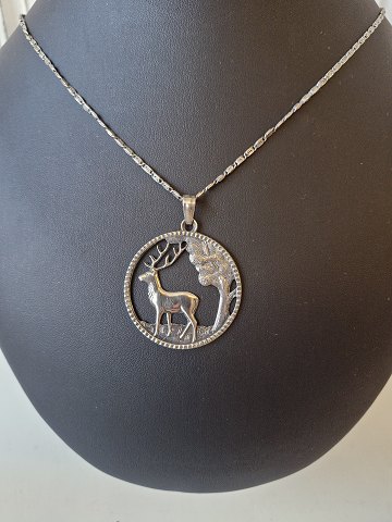 Necklace and pendant in silver, the pendant is designed as a forest area with deer.