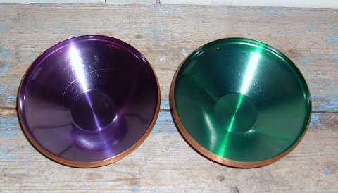 Par Corona kobber skåle med lilla og grøn emalje. Fremstår med brugs spor. Stemplet Corona Denmark. Højde 6cm. Diameter 18cm.