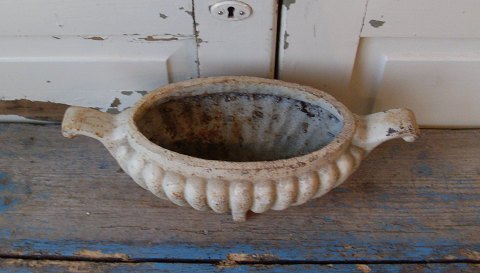 Lækker cremefarvet jern jardinere. Fremstår med hul/dræn i bunden, så vandet kan løbe fra. Højde 14cm. Længde 35cm.