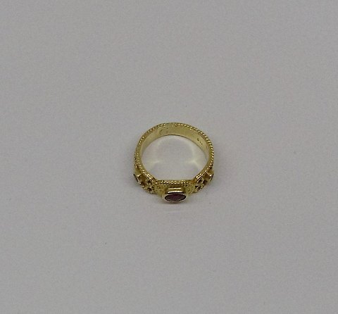 Smuk 18kt guldring med oval rubin flankeret af to sorte safire.