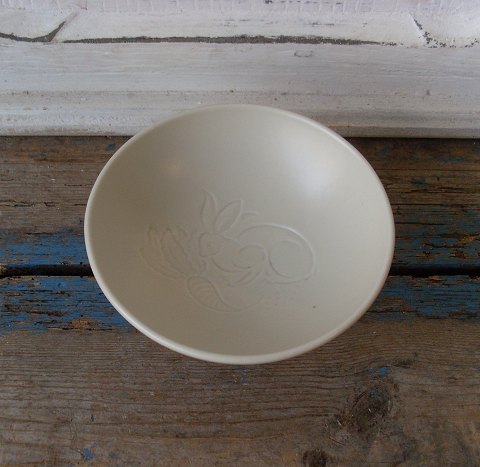B&G Art Deco skål på fod, dekoreret med kanin og gulerod i relief. No. 1204/381, 2. sort. Højde 7 cm. Diameter 12 cm.