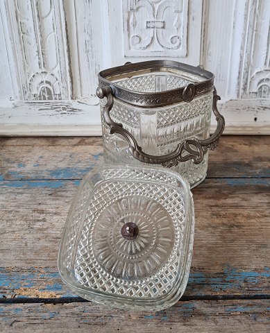 Smuk gammel kiksespand i presset glas med tin montering
