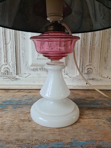 Beautiful 1800s opaline lamp with oil container in pink / raspberry colored glass. Remodeled for electricity.