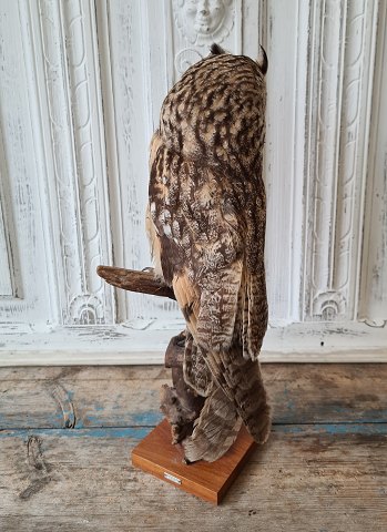 Beautiful stuffed wood horned owl mounted on a natural branch. Appears with Seits number. Height 45 cm.