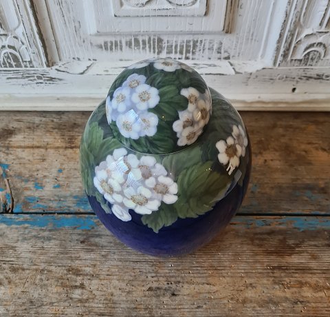 Royal Copenhagen Art Nouveau lågvase dekoreret med jordbærblomster, jordbær løv på blå bund. Bemalet af Else Hasselriis 1878-1953 |