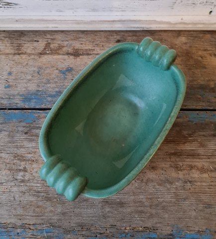 Michael Andersen riflet skål med hanke i smuk grøn farve Mål 12 x 20,5 cm. Højde 8 cm. Fremsår med mikro glasur chip.