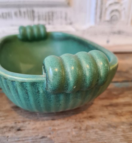 Michael Andersen ribbed bowl with handles in beautiful green color Measurements 12 x 20.5 cm. Height 8 cm. With micro glaze chip.
