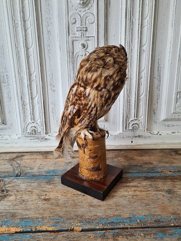 Stuffed forest horned owl mounted on birch stump By conservator Chr. Aaboe Sørensen Height 34 cm.