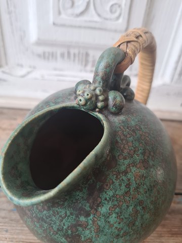Arne Bang kande med bast håndtag. Kanden har en utrolig smuk grøn glasur. Signeret AB - 151 Højde 17 cm. Fremstår fejlfri