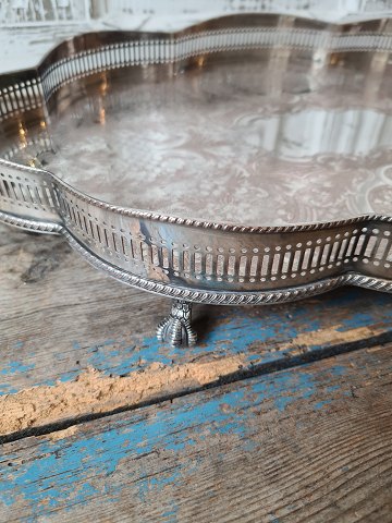 Oval silver plated tray with gallery edge, the tray stands on small "ball and claw feet" Stamped: Silver plated copper - made in Sheffield England Measurements 30 x 45.5 cm. Height 6 cm.