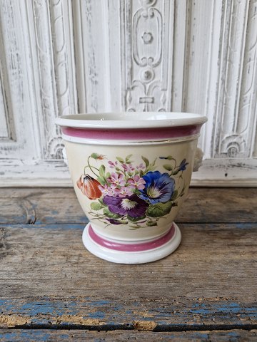 B&G urtepotteskjuler forsynet med hanke i form af kvindeansigter i bisquit. Urtepotten er smukt dekoreret med blomstremotiver 1852-95