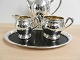 Smukt kaffeservice i hammerslået sølv bestående af kaffekande, sukkerskål, flødekande og bakke med sølv kant og bund af bakelit.