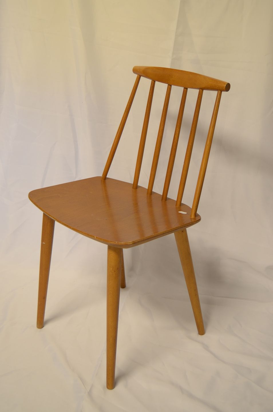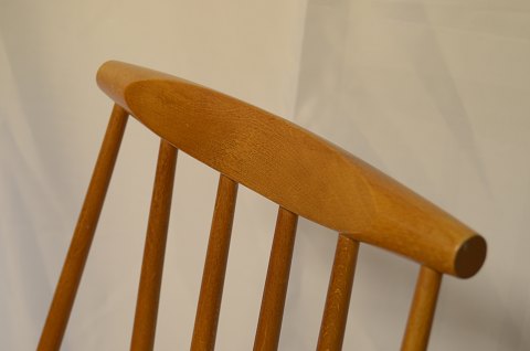 Spisebordsstol i lakeret træ. Stolen er velholdt og har en fin detalje ved ryglænets topstykke. Pris: 400 kr.