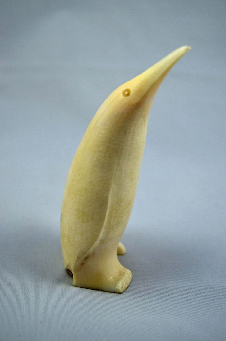 Figur af en pingvin udskåret af stødtanden fra en hvalros. Pingvinen er meget flot forarbejdet og i flot stand. Højde: 11 cm. Pris: 2000 kr. Varenr.: 204594