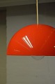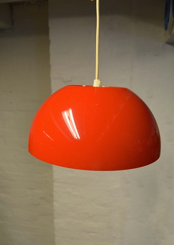 Rød loftslampe i hård plast i et enkelt design. Lampen er velholdt med få overfladiske brugsspor. Højde: 12 cm. Ø: 25 cm. Pris: 450 kr.