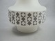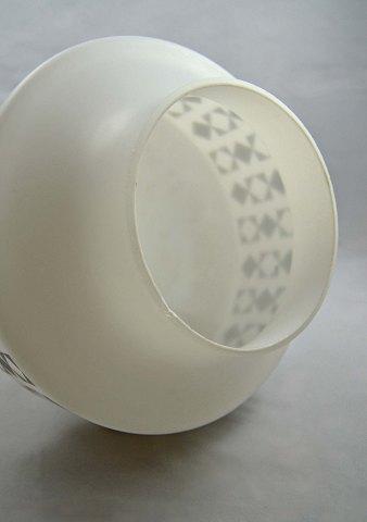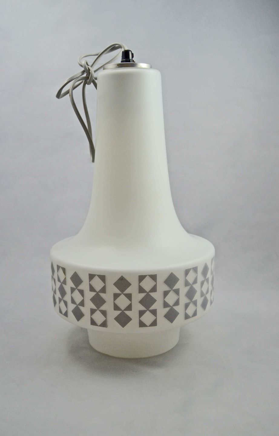Glaspendel lampe i retro design med grafisk mønster i lys grå farve. Lampen er i pæn stand med intakt mønster. Der er meget små hak i lampens nederste kant. Højde. 36 cm. Ø: ca. 21 cm. Pris: 450 kr.