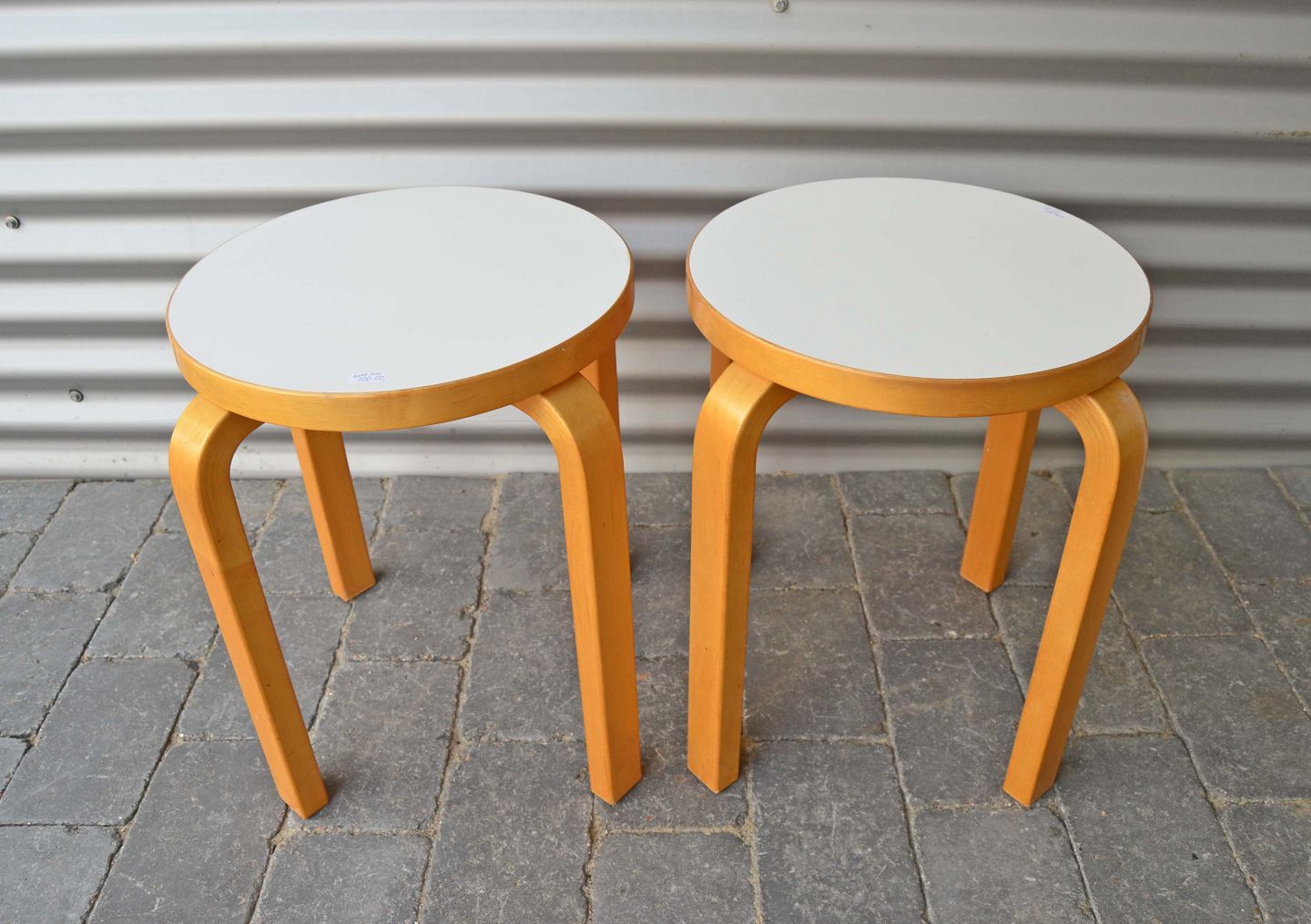 To styk Alvar Aalto skamler. Skamlerne er udformet i bøg med hvid laminat top. Skamlerne er velholdte. Højde: 44 cm. Ø: 41 cm. Pris pr. stk. 800 kr.