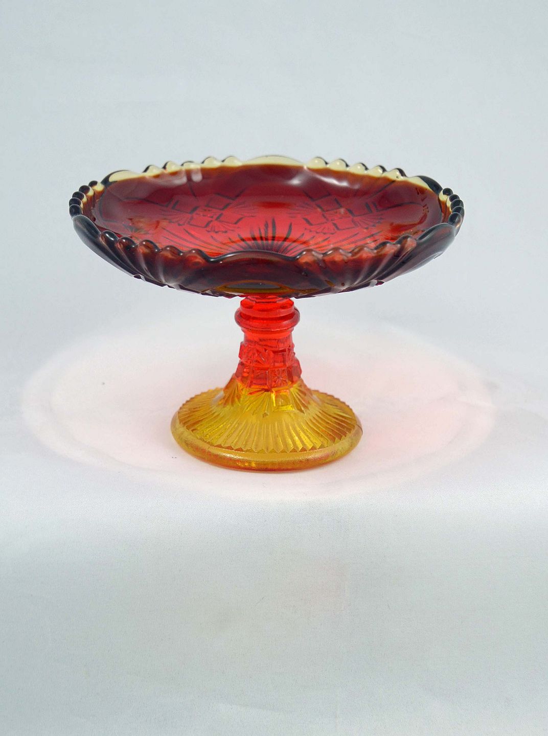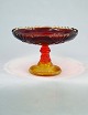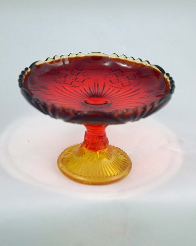 Sukkeropsats fra Fyens Glasværk. Den er udformet i rødt glas med fod i gul nuance.