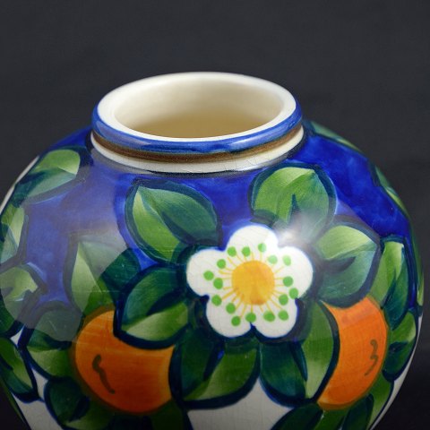 Aluminia vase (de. nr. 740/822). Vasen har en mindre reparation ved topkanten. Hvid blomst og gule frugter, samt grønne blade.
