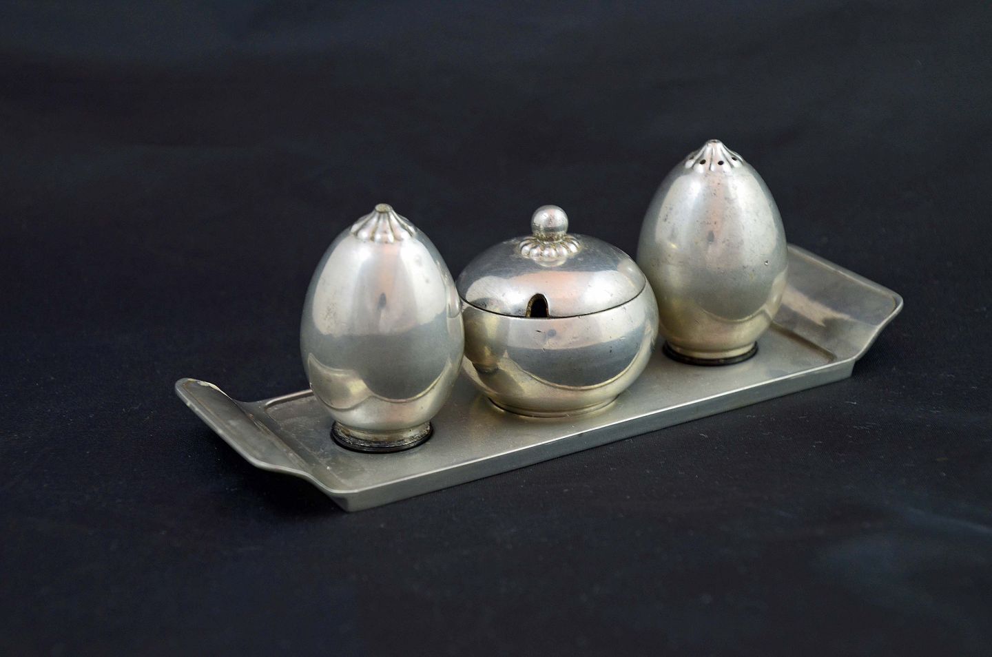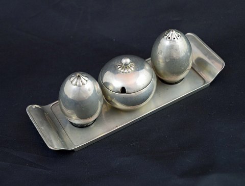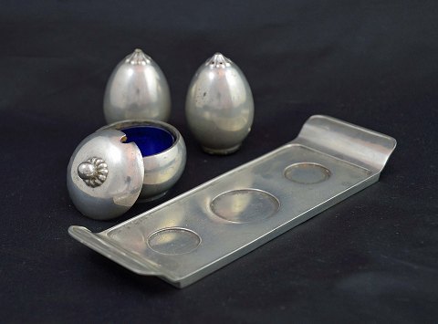 Salt og peber sæt af Just Andersen med intakt blå glasindsats i saltkaret.
