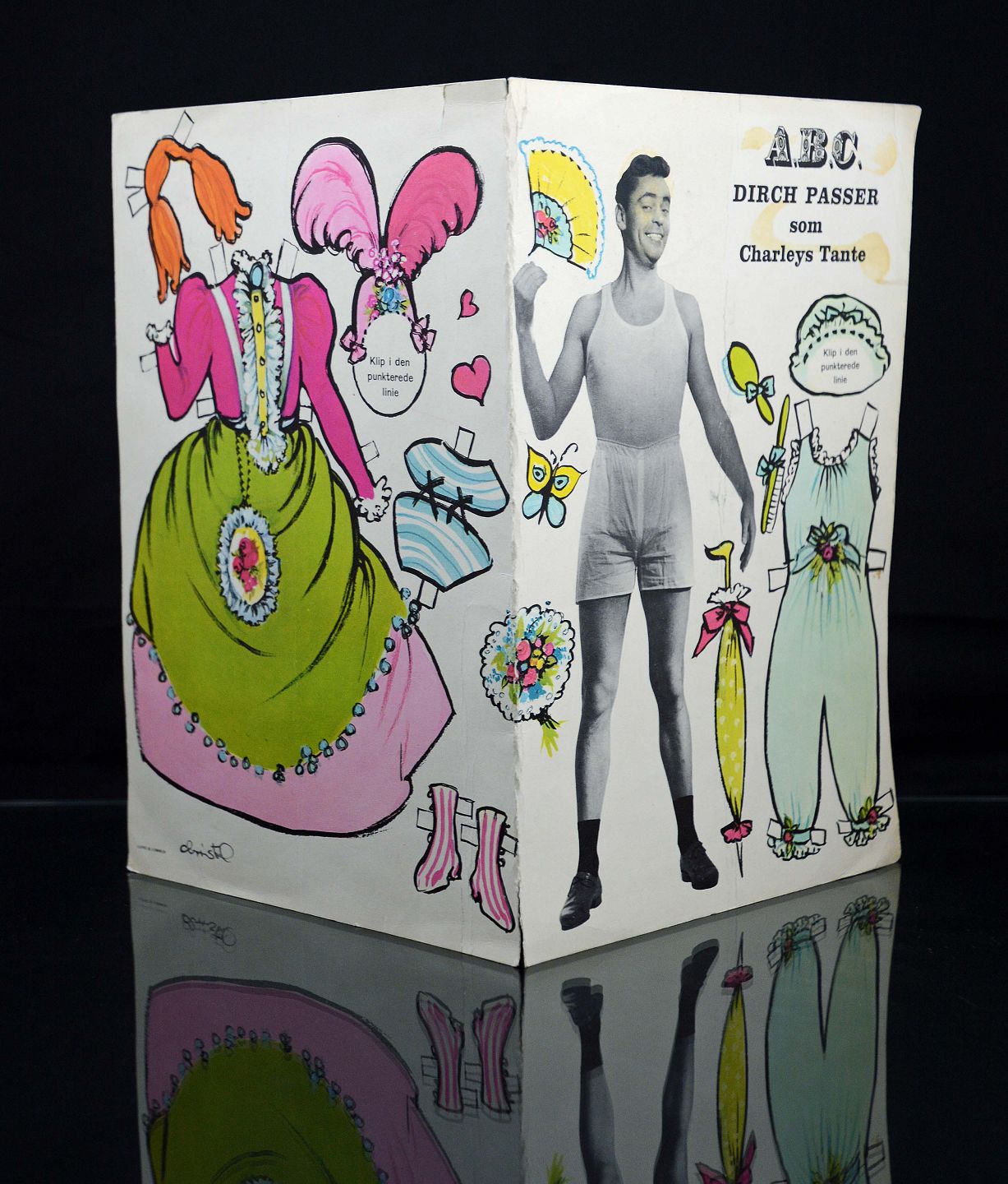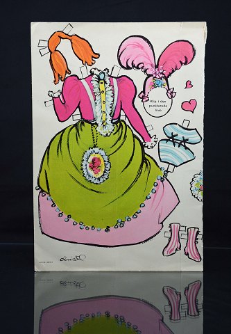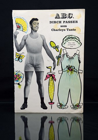 Påklædningsdukke i papir/pap af Dirch Passer som Charleys tante fra Lund & Lommer. Det er i god stand. H. 25 cm. B. 34,5 cm.